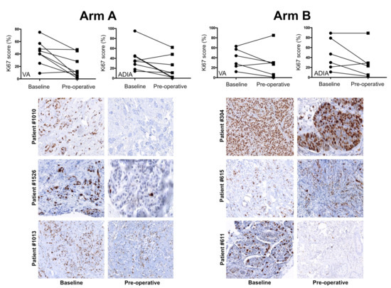 Individual changes in Ki67 scores among METTEN study patients with a residual tumor after neoadjuvant treatment. Top: changes in Ki67 score for individual patients at baseline and post-treatment according to treatment arm and scoring method. Bottom: representative images of Ki67 expression staining are shown for each pair of biopsies at baseline and approximately one week before surgery (pre-operative) in individual patients.