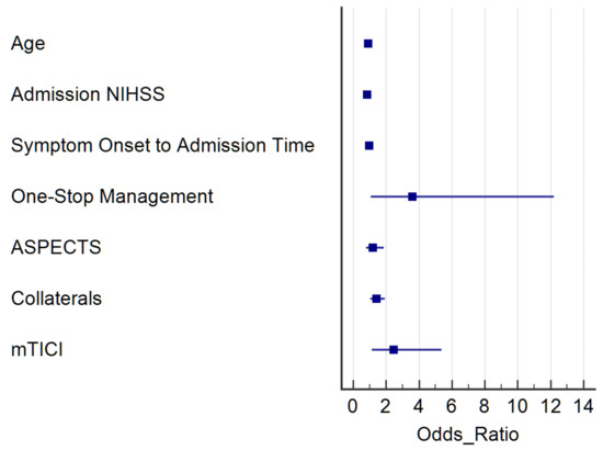 The case-control analysis revealed 43 LVO matches for each group (one-stop vs. traditional management). Matching variables were not significantly different between one-stop and traditional workflow patients; other baseline and imaging characteristics (e.g., collaterals) were also balanced between the two groups (Table 3). We observed a significant reduction of door-to-groin and door-to-reperfusion times, both during working and off-duty hours, for direct admission and transfer patients. Safety variables, such as sICH, any hemorrhage on follow-up imaging or mortality were comparable between the two groups. Median discharge and 90 d mRS in the one-stop group was three (IQR 1–5) and two (IQR 1–5), respectively. The rate of good functional outcome at 90 days was significantly higher in the one-stop management group with 58% (25/43) as compared to 33% (14/43) in the normal workflow group (p = 0.029). In the logistic regression model comparing predictors of favorable clinical outcome in the matched population, the one-stop management (odds ratio (OR) 3.75; 95% confidence interval (CI) 1.13–12.44; p = 0.031) and successful reperfusion (OR 2.58; 95% CI 1.19–5.55; p = 0.015) were significant contributors to the prediction of a favorable outcome (Figure 1).