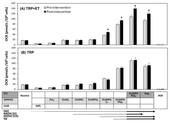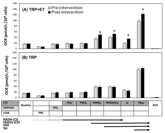 Effects of TRP with (A, TRP + ET) and without (B, TRP) exercise training in platelet mitochondrial O2 consumption rate (OCR) using the reference protocol 2 (RP2) protocol in patients with cerebral vascular accident. P, pyruvate; M, malate; G, glutamate; S, succinate; Oct, octanoyl-carnitine; Gp, glycerophosphate; Rot, rotenone; Ama, antimycin; ROX, residual O2 consumption; OXPHOS or P, oxidative phosphorylation; ETC or E, electron transport system; LEAK or L, uncoupling proton leakage. Pre-intervention vs. post-interve ntion, * p < 0.05. Values were mean ± SEM.