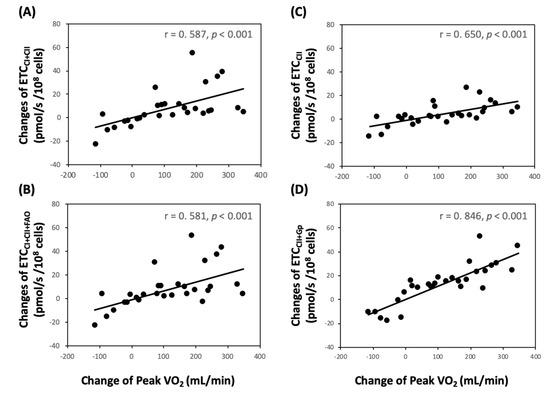 Notably, TRP + ET for 4 weeks significantly increased platelet flavin adenine dinucleotide (FADH2) in CII-related ETC levels (PMGSE, PMGSOctE, SE, and SGpE) (Figure 1A, p < 0.05). Moreover, changes in VO2peak levels were directly related to changes of PMGSE (Figure 3A, r = 0.587, p < 0.001), PMGSOctE (Figure 3B, r = 0.581, p < 0.001), SE (Figure 3C, r = 0.650, p < 0.001), and SGpE (Figure 3D, r = 0.846, p < 0.001).
