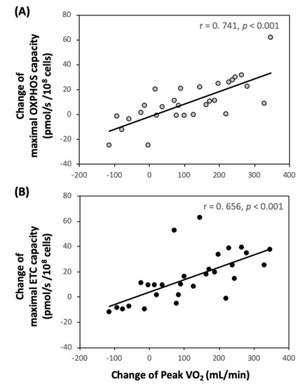 On the other hand, TRP + ET also enhanced succinate-involved platelet OXPHOS levels (Figure 2A, p < 0.05), such as OctMPGSP, rather than OctMPGP. Furthermore, the exercise regimen also augmented the capacities of the maximal OXPHOS (OctMPGSGpP, p < 0.05) and ETC (OctMPGSGpE, p < 0.05) in platelet (Figure 2A). Additionally, changes in VO2peak levels were positively associated with changes in OctMPGSGpP (Figure 4A, r = 0.587, p < 0.001) and OctMPGSGpE in platelet (Figure 4B, r = 0.581, p < 0.001). However, no significant changes in platelet mitochondrial bioenergetics, including ETC and OXPHOS capacities, were observed in the control subjects (Figure 1 and Figure 2).