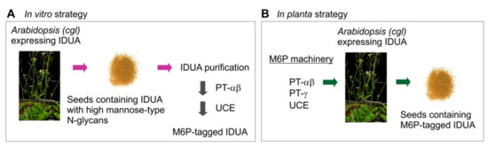 An alternative strategy is to express the entire human M6P machinery in plants that are already expressing IDUA or another lysosome enzyme (Figure 1B). In this strategy, the entire M6P elaboration process will be carried out in planta via essentially the same mechanisms as in mammalian cells. Since recombinant proteins expressed in seeds are generally stable when the transgenic mature dry seeds are stored under conventional (cool and dry) conditions, e.g., iduronidase [34], the final recombinant products can be expected to remain stable. The resultant lysosome enzymes need only be purified when required.