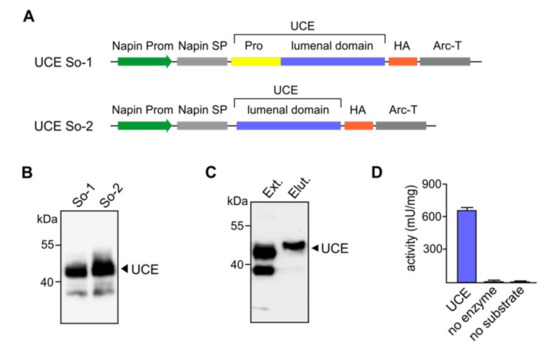 ln mammalian cells the TGN-localized UCE occurs as a tetrameric transmembrane protein and functions to remove a covering GlcNAc from the M6P recognition marker on lysosomal acid hydrolases. The UCE is synthesized as an inactive proenzyme that is activated by the endoprotease furin, which cleaves an RARLPR↓D sequence to release a 24-amino acid propiece. As furin is localized in the TGN, newly synthesized UCE is inactive until it reaches this terminal compartment of the Golgi apparatus [27]. It was unknown if the propeptide would be essential for the functional expression, synthesis and folding of the UCE in the plant host cells. Since plant cells do not produce furin but other furin-like enzymes, it was equally unknown whether the UCE would be correctly processed in the same way as in the TGN of mammalian cells so that the propeptide piece would be removed. Therefore, to assess these possibilities, constructs with or without sequences specifying the propeptide were generated (Figure 2A). In place of the transmembrane domain and cytoplasmic tail sequences, the sequence encoding a HA-tag at the C-terminus of the soluble UCE was included in each construct to facilitate downstream purification of the enzyme.