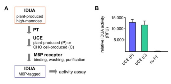 Plants do not possess the enzymatic machinery to elaborate the M6P tag onto target proteins―the PT and UCE. Yet in previous work we have demonstrated that the purified plant-recombinant IDUA is amenable to sequential in vitro processing using soluble forms of the PT and UCE to add the M6P recognition marker [4,6].