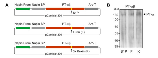 For the PT-αβ constructs, the αβ-precursor needs to be cleaved into separated α and β subunits after its synthesis. Plant cells possess similar but not identical processing enzymes to those of human cells. To ensure a greater possibility of correct cleavage, we designed three separate PT-αβ constructs each carrying one of the three different cleavage sites: the native S1P cleavage site, a furin site, and a 3 x kexin site.