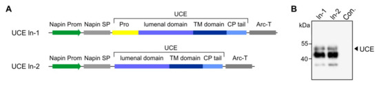 As in the case of the two soluble UCE proteins (So-1 and So-2), several dozens of lines were screened for expression of the In1 (with propeptide) and In2 (without propeptide) constructs for generating the UCE as an integral protein localized within the plant TGN (Figure 6A). The ~50-kDa band is indicative of the mature full size UCE protein and further indicates that the UCE-propeptide precursor underwent cleavage of the propeptide within the plant host cells (Figure 6B).