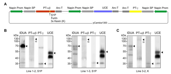 In planta elaboration of the M6P-tag onto IDUA proteins requires that all three genes encoding the M6P-machinery and the target hydrolase IDUA are expressed simultaneously (Figure 1B). Considering the three options for PT-αβ cleavage, the three different constructs to effect simultaneous expression were used to individually transform the Arabidopsis cgl line A4.7 [6] that was already synthesizing a high level of human IDUA. Although each gene is controlled independently for more efficient transcription, a single plasmid encoding PT-αβ, PT-γ, and UCE was generated to make the screening process much easier (Figure 7A). Several dozens of transgenic plants were obtained from the transformation. Western blots of seed extracts from three representative lines revealed that all four proteins are synthesized at detectable levels (Figure 7B,C). Seeds of lines with high levels of IDUA, such as line 1–2 (Figure 7B), are ideal candidates for subsequent examination of the status of IDUA phosphorylation and efficacy.