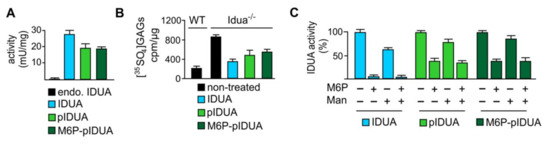 Embryonic fibroblasts from wild-type and Idua-deficient mice were incubated for 24 h with serum-free Opti-MEM™ medium containing 100 µCi/mL Na235SO4 (Hartmann Analytic, Braunschweig, Germany). Cells were then washed twice with PBS and incubated for 24 h with serum-free Opti-MEM™ medium in the presence or absence of 5 μg/mL Aldurazyme®, pIDUA or “putative” M6P-pIDUA (hereafter in most places of the text referred to simply as M6P-pIDUA). To remove cell surface proteoglycans, cells were washed with PBS and treated with 0.05% trypsin/EDTA solution for 20 min. Afterwards the cells were lysed in 0.1 M NaOH and neutralized in 50 mM sodium acetate (pH 6.0) and 0.2 M NaCl. For protein digestion the lysates were incubated overnight with 100 μg/mL pronase (Sigma-Aldrich, St. Louis, MO, USA) at 37 °C. GAGs were purified using diethylaminoethylcellulose-sepharose anion exchange chromatography (Sigma-Aldrich, St. Louis, MO, USA) and the radioactive GAG amount was measured in a scintillation counter and related to the protein content.