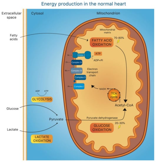 The heart has a very high energy demand imposed by the maintenance of specialized cellular processes, such as intracellular ion homeostasis and contractile function of cardiomyocytes. Due to the limited capacity for substrate storage in the heart, the balance between substrate demand and oxidation is pivotal to normal cardiac function and is finely regulated at multiple levels []. Under normal conditions, adenosine triphosphate (ATP) is produced predominantly (70%–80%) from fatty acid (FA) oxidation in mitochondria, while the remaining 20% to 30% derive from oxidation of glucose and lactate, with a minor contribution of ketone body and amino acid oxidation [,], (Figure 1). Of note, glucose oxidation is energetically more efficient than FA β-oxidation (FAO), since more ATP is produced for any given amount of molecular oxygen (O2) consumed (3.17 ATP/O2 formed from glucose vs. –2.5 ATP/O2 formed from FA) []. A rather simplistic view proposes that the heart’s metabolic over-reliance on FA depends on a much larger availability of body fat reserves―at any given moment―than those available from glucose [].