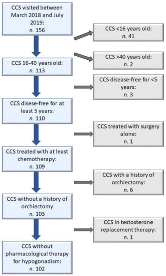 One hundred and fifty-six male patients visited the outpatient clinic dedicated to long-term survivors of childhood cancer between March 2018 and July 2019. Among them, 54 patients were excluded: 41 were too young, 2 were too old, 3 had finished antineoplastic treatment less than five years before, 1 was treated with surgery alone, 6 underwent unilateral orchiectomy for testicular tumor, 1 was on testosterone replacement therapy for an already diagnosed primary hypogonadism (Figure 1).