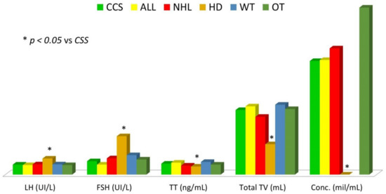 After patients’ grouping according to diagnosis, only the HD group showed significantly higher LH and FSH values and significantly lower TT values compared to overall sample of childhood cancer survivors (p = 0.013, ˂0.001, and 0.027, respectively) (Table 2, Figure 3).