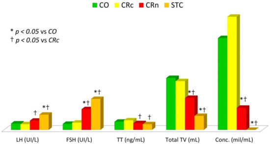Comparison of hormonal values, total testicular volume, and sperm concentration among childhood cancer survivors grouped according to therapy. CO: chemotherapy only; Conc.: sperm concentration; CRc: chemotherapy plus cranial irradiation; CRn: chemotherapy plus non-cranial irradiation; FSH: follicle-stimulating hormone; LH: luteinizing hormone; STC: stem cell transplantation; TT: total testosterone; TV: testicular volume.