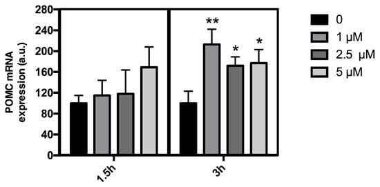 Effect of leptin on pro-opiomelanocortin (POMC) mRNA levels in the mHypoA-POMC/GFP cell line. Cells were incubated during 1.5 or 3 h in the absence (control; dark bars) or presence of different doses of leptin (1, 2.5, and 5 μM) (gray bars). The relative concentrations of POMC mRNA were determined by quantitative RT-PCR. GAPDH was used as the endogenous controls. The data are expressed as the mean ± SEM of at least three independent experiments. The values are presented as means ± SEM. * p < 0.05; ** p < 0.01.