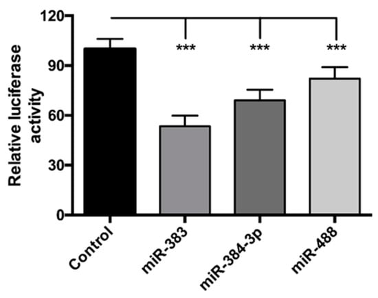 We have previously identified through in silico approach three miRNAs that could target the POMC and whose expression is under the control of leptin [13]. To confirm the effect of miR-383, miR-384-3p, and miR-488 on POMC, we transfected POMC 3′UTR with miR mimics. miR-488 was used as a positive control for the experiment, given that it has already been reported to target POMC [31,32]. The ratio of Renilla to firefly luciferase activity was significantly decreased for miR-383, miR-384-3p, and miR-488 (−47%, −31%, and −18%, respectively) (Figure 2), validating our experimental conditions, and strongly suggesting that POMC may be considered as a target of miR-383, miR-384-3p, and miR-488.