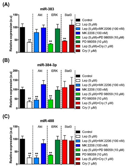 Leptin modulates the expression of the miRNAs of interest by different pathways. Effect of leptin on miR-383 (A), miR-384-3p (B), and miR-488 (C) expression after 24 h of pharmacological inhibition of JAK2-STAT3, PI3K-Akt, and MEK 1/2/ERK pathways. The data are expressed as the mean ± SEM of at least three independent experiments. The values are presented as means ± SEM. ** p < 0.01.