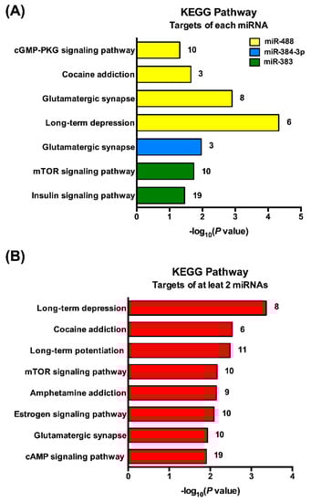 To further study the functions and underlying mechanisms of these three miRNAs of interest, KEGG (http://diana.imis.athena-innovation.gr/DianaTools/index.php) was used to examine the signaling pathways of specified miRNA target genes. We found that the 3 miRNAs are involved in several pathways (Figure 4A). According to enrichment score, long-term depression (LTD), glutamatergic transmission, cocaine addiction and cGMP-PKG signaling pathway are the main signaling pathways associated with miR-488 (Figure 4A). The pathways most correlated with miR-384-3p and miR-383 were glutamatergic synapse, mTOR, and insulin signaling pathways (Figure 4A). In addition, we also examined the signaling pathways associated with simultaneously at least 2 miRNAs. This analysis revealed that the target genes of at least 2 miRNAs are associated with neurotransmission, addiction, and different signaling pathways (Figure 4B).