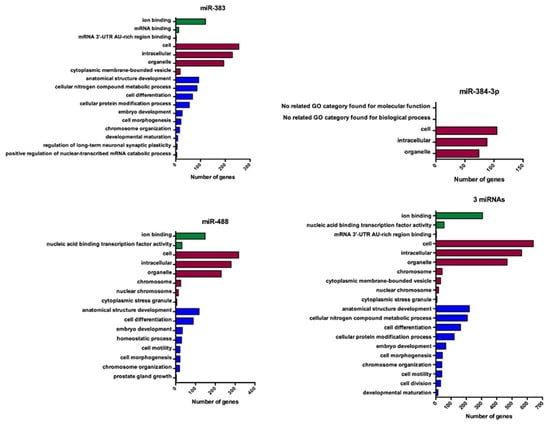Using GO-analysis, the functional categories associated with the miRNAs of interest were identified. We explored three domains: biological process (BP), cellular component (CC), and molecular function (MF). This analysis revealed that the genes targeted by miR-383 and miR-488 are involved in several important biological pathways (Figure 5). In contrast, genes targeted by miR-384-3p are involved only in CC domain (Figure 5). Finely, the genes targeted by the 3 miRNAs are involved in a large panel of biological functions (Figure 5).