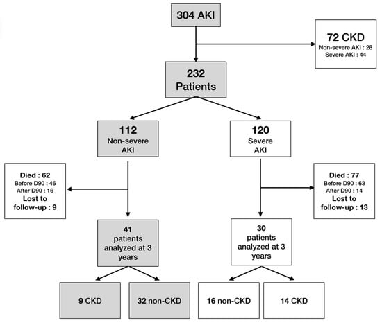 Patients were enrolled if they were 18 years of age or older, received invasive mechanical ventilation, catecholamine infusion, or both, and developed AKI assessed by an increase of serum creatinine (SCr) of >26.5 µmol/L within 48 h or an increase of >1.5 times the baseline value, according to KDIGO guidelines [11]. Patients with an estimated glomerular filtration rate (eGFR) < 90 mL/min/1.73 m2 prior to ICU admission, using the chronic kidney disease epidemiology collaboration (CKD-EPI) formula, were excluded. Serum creatinine assays were standardized (IDMS calibration). Enrollment and collection of hospitalization data were recorded prospectively. Follow-up outcomes were collected prospectively three years after enrollment for each patient, in order to limit memorization bias or loss of data, using medical records and phone calls with GPs and patients.