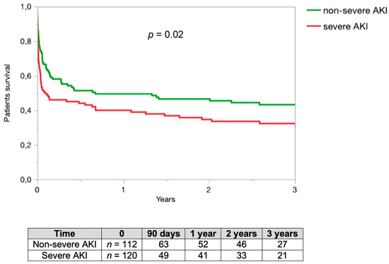 Patients survival was assessed in the set of 232 included patients. At three years, survival was 38% in our series. The three years survival was 43% in the non-severe AKI group and 32% in the severe AKI group with statistical difference (p = 0.02) (Figure 2).