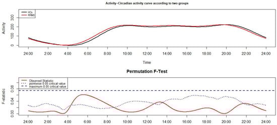 The results of the FLM analysis are reported in Figure 1. In the upper panel are reported the CAR of RRMS patients and HCs, and the results of the non-parametric permutation F-test are reported in the lower panel. Differences between groups are detected when the observed statistic (i.e., the red solid line) is above the test of significance with the α level set at 0.05. The blue dashed line represents the global test of significance, while the dotted line represents the point-wise test of significance. Although the global test is preferred because it represents the most conservative level of significance, the point-wise test of significance, even if less conservative, is a useful threshold to detect relevant differences in motor activity []. Observing Figure 1, it is possible to note that RRMS patients show a peak in motor activity, around 5:00 a.m., higher than that of HCs.