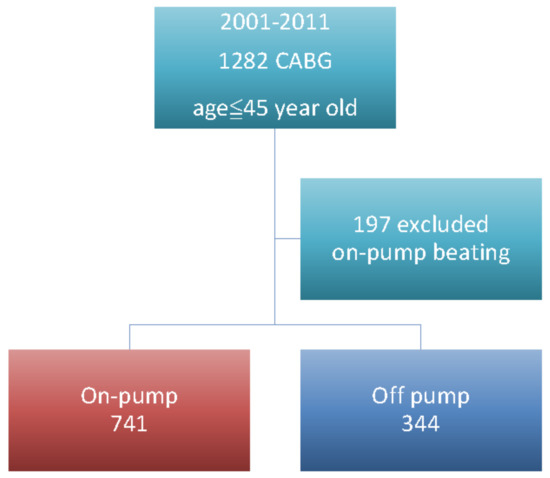 There were 31,448 patients that had undergone CABG in the database. From these, we included 1282 patients who were 45 years old or younger and had isolated on-pump or off-pump CABG. Among these, 197 patients were excluded due the use of an on-pump beating heart technique, as shown in Figure 1. The average overall follow-up time was 5.3 years and the longest was 16 years, with 100% complete follow up. The mean follow-up times were 4.79 years for off-pump CABG and 5.53 years for on-pump CABG.