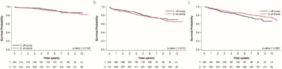 Regarding the completeness of revascularization, we used graft number/disease vessels as a marker; if the number is more than 1, we deem this as complete revascularization in our database. By doing so, the completeness of revascularization in one vessel disease was 100% in both groups. The completeness of revascularization in two-vessel disease was 93% in the off-pump group and 95% in the on-pump group. The completeness of revascularization in three-vessel disease was 91% in the off-pump group and 92% in the on-pump group.