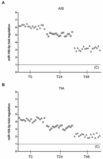 At admission (T0), circulating miRNA-195-5p (2^−ΔCt = 5.5 ± 0.4) were significantly upregulated in AIS patients, compared to both TIA (2^−ΔCt = 3.9 ± 0.35, p < 0.01 vs. TIA) and control subjects (2^−ΔCt = 0.91 ± 0.1, p < 0.01 vs. C). In AIS patients, at 24 h after admission, circulating miRNA-195-5p (2^−ΔCt = 4.6 ± 0.3) was significantly upregulated, compared to TIA (2^−ΔCt = 3.1 ± 0.4, p < 0.01 vs. TIA) and control subjects (2^−ΔCt = 0.83 ± 0.1, p < 0.01 vs. C). In AIS patients, at 48 h after admission, circulating miRNA-195-5p (2^−ΔCt = 2.9 ± 0.28) was significantly upregulated, compared to TIA (2^−ΔCt = 1.9 ± 0.35, p < 0.01 vs. TIA) and control subjects (2^−ΔCt = 0.88 ± 0.1, p < 0.01 vs. C) (Figure 1).