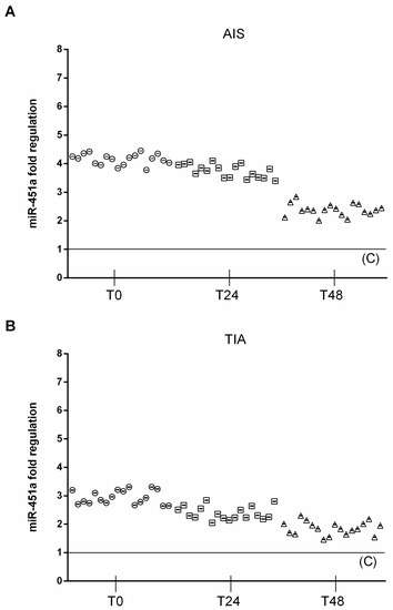 Similarly, circulating miRNA-451a (2^−ΔCt = 9.26 ± 0.82) was significantly upregulated in AIS patients at T0 compared to both TIA (2^−ΔCt = 6.5 ± 0.52, p < 0.01 vs TIA) and control subjects (2^−ΔCt = 2.2 ± 0.5, p < 0.01 vs. C). In AIS patients, 24 h after admission, circulating miRNA-451a (2^−ΔCt = 8.2 ± 0.66) was significantly upregulated, compared to TIA (2^−ΔCt= 5.2 ± 0.63, p < 0.01 vs. TIA) and control subjects (2^−ΔCt = 2.0 ± 0.5, p < 0.01 vs. C). In AIS patients, 48 h after admission, circulating miRNA-451a (2^−ΔCt = 5.3 ± 0.55) was significantly upregulated, compared to TIA (2^−ΔCt = 4 ± 0.48, p < 0.01 vs. TIA) and control subjects (2^−ΔCt = 2.3 ± 0.5, p < 0.01 vs. C) (Figure 2).