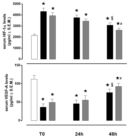 Serum levels of HIF-1α and VEGF-A. Values are expressed as pg/mL ± S.E.M. The control group is reported as white column; AIS group is reported as black column and TIA group is reported as grey column. ★ p < 0.01 vs. C; § p < 0.05 vs. AIS T0; ≠ p < 0.05 vs. TIA T0.