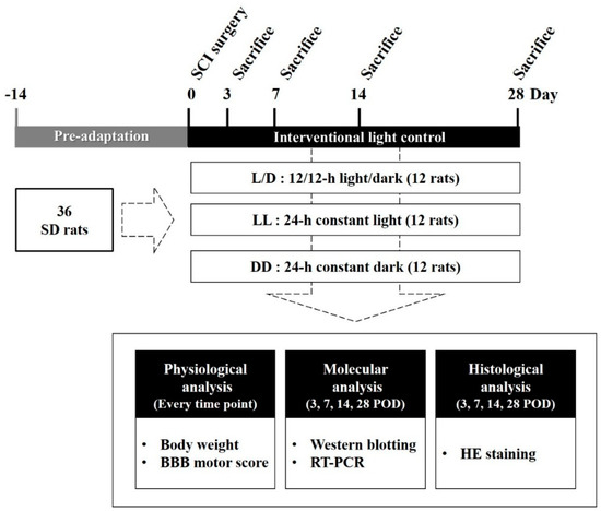 All animal procedures were approved and performed in accordance with the guidelines and protocols approved by the Institutional Animal Care and Use Committee of Inje University (approval No. 2015-05). A total of 36 male Sprague–Dawley rats (SD rats; 8-week-old; 250–280 g) were used. We applied the different light/dark conditions to alter the melatonin biosynthetic pathway through regulation of arylalkylamine N-acetyltransferase (AANAT) expression [22]. Conditional controlled light/dark cycle was applied as follows; 12/12-h light/dark (L/D), 24-h constant light (LL), and 24-h constant dark (DD). ZT0 was set at 07:00 in the L/D condition. The rats were pre-adapted for at least 2 weeks prior to SCI. After the pre-adaptation, animals were randomly divided into 3 groups; L/D, LL, and DD. In turn, each group consisted of 12 rats which were recategorized by 4 sacrifice points (POD 3, 7, 14, and 28). In this way, 3 rats per group were assigned to each time point (Figure 1). At each sacrifice point, CSF was collected, then, the animals were sacrificed for further analyses. For the analyses, we collected both the primary lesion site (T9–11) and indirect injured segments (T6–8, L1–2).