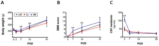 To induce changed diurnal cycle of endogenous melatonin synthesis, light/dark cycle was conditionally controlled as following; 12/12-h light/dark (L/D), 24-h constant light (LL), and 24-h constant dark (DD). At 3, 7, 14, and 28 days after SCI surgery, the body weight and functional recovery were assessed, and then the spinal cord tissues were excised from sacrificed animals for further analyses. The mean body weight was greater in the SCI + DD group than that of the L/D and the LL group, which appeared from POD 7 (a,b p < 0.05, Figure 2A). The BBB scores gradually increased in all of the spinal cord injured rats with time, indicating spontaneous behavioral recovery regardless of the light/dark condition. A remarkable increase of the behavioral scores from POD 7 was seen in the rats exposed to DD condition (a,b p < 0.05), while LL condition delayed the time for locomotor recovery (a p < 0.05, Figure 2B). Interestingly, increased CSF melatonin level was found in all animals at POD 3. Especially, rats with constant dark condition showed the greatest CSF melatonin concentration (a,b p < 0.05, Figure 2C). This tendency was temporary, and no differences were found in further timepoints.