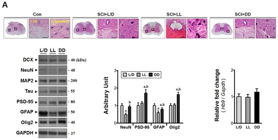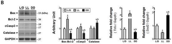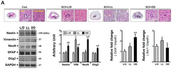 Molecular analyses were performed to determine the effect of elevated melatonin during acute phase on the damage responses in the lesion site (Figure 3A). Both nestin and vimentin levels (neural stem cell markers) were increased under DD condition (a,b p < 0.05). In addition, Ciliated ependymal cells (Nestin+/Vimentin+) have latent neural stem cell properties, which are rapidly activated to re-connect the disrupted neural circuit following spinal cord injury [8]. Oct4 expression was also upregulated (a,b p < 0.05) by DD condition indicating that constant darkness may enhance endogenous pluripotency following spinal cord injury. Besides, the marker of oligodendrocyte Olig2 was highly expressed in the T9-11 segments of DD group (a,b p < 0.05). Also, the expression of NeuN (a neuronal marker) showed similar tendency (a,b p < 0.05). It is considered that the DD condition conserved neural cells from apoptotic cell death, as compared to other groups. This was evidenced by less activation of apoptotic machinery (a,b p < 0.05, Figure 3B), which was mediated through regulation of gene transcription (Tnfα, Sod2) and the increase of anti-oxidant catalase (a,b p < 0.05). In contrast, LL condition exacerbated early histological severity. Spinal cord sections from all groups showed loss of ependymal lining in the central canal, scant cells mostly within the gray matter, and neutrophil degeneration in lamina IX. However, those characteristics were especially severe in the sections from LL group animals. The nestin levels between L/D and LL groups had no differences in spite of ependymal loss. Instead, LL condition induced upregulation of Oct4 expression as well as vimentin level (a p < 0.05). This indicates that the histological severity following constant light condition may initiate fierce remodeling since Vimentin is reported to extensively be expressed by the reactive astrocytes [26] as well as macrophages [27] besides ependymal cells [28]. No change in the GFAP level (an astrocyte marker) was found; however, Iba1 expression (a microglial marker) was significantly increased (a p < 0.05). Concurrently, LL condition augmented not only the level of Tnfα mRNA (4.3-fold) but also the Bax:Bcl-2 ratio (a p < 0.05) suggesting vulnerability to cell death. Additionally, the LL condition appears to make the injured tissue prone to oxidative stress as antioxidant Sod2 expression was attenuated (a p < 0.05). Taken together, these results suggest that light/dark control might be important for the primary damage responses in the traumatic zone.