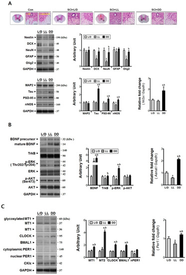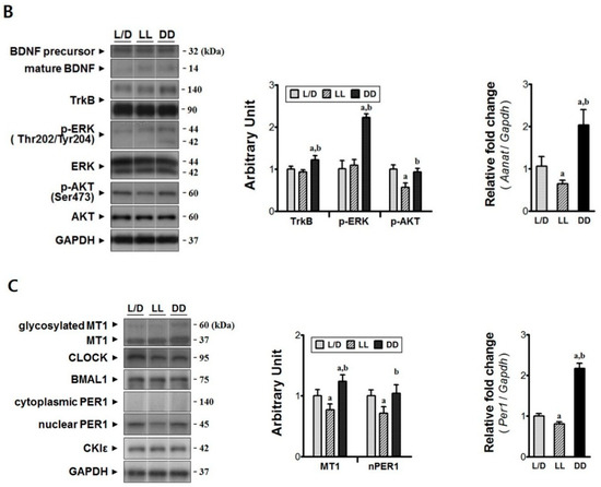 The mid-thoracic spinal cord (T6-8), which is the right upper segment of injury epicenter, was analyzed to determine whether light/dark condition influences the neural remodeling processes in the rostral region. Dark environment was revealed to also be beneficial to the mid-thoracic region. The level of axonal marker, Tau, was significantly augmented under DD condition (a,b p < 0.05, Figure 4A), although neural lineage markers (Nestin, DCX, NeuN, GFAP, Olig2) were remained unchanged in the immunoblot. Moreover, this condition increased the level of PSD-95 protein (an excitatory post-synaptic marker) as well as NMDA receptor subunit Nr2a expression (a,b p < 0.05). Also, Neuronal NOS (nNOS) level was also upregulated (a,b p < 0.05), indicating that excitatory signal transduction might be activated at POD 3 in the rostral region. These changes were accompanied by regulation of TrkB and its downstream ERK signal. Exposure to DD condition did not affect total TrkB level, but facilitated ERK phosphorylation (a,b p < 0.05, Figure 4B). TrkB receptor is known to be activated by binding of a putative ligand BDNF [19]. Interestingly, both DD and LL condition induced higher BDNF levels compared to L/D, though, TrkB-mediated ERK signal transduction was only enhanced under DD condition (a,b p < 0.05). Moreover, exposure to DD condition enhanced the Aanat expression at POD 3 in the T6-8 segments (a,b p < 0.05). This was accompanied by the increases of clock proteins (CLOCK, BMAL1, and nuclear PER1) as well as Per1 mRNA upregulation at the time of sacrifice (a,b p < 0.05, Figure 4C). Concurrently, the levels of melatonin receptors (MT1, MT2) were also augmented (a,b p < 0.05). These results suggest that increase of melatonin under DD condition might induce synaptic modification through clock-controlled Aanat expression. In contrast, the effect of LL condition was detrimental to neural remodeling occurred in the rostral region. The neuronal lineage markers DCX, NeuN, Olig2, and nNOS protein levels were reduced (a p < 0.05), and intraspinal hemorrhage was seen also. Exposure to LL condition suppressed neural expression of Aanat mRNA, TrkB glycosylation, and ERK phosphorylation (a p < 0.05). Although NAS-TrKB-ERK signal transduction might be dampened, maturation of proBDNF was augmented (a p < 0.05). These changes were accompanied by the reductions in Per1 expression as well as the PER1 protein distributed in the nuclei (a p < 0.05). Taken together, the LL condition partially inhibited the clock mechanism, and deteriorated neural remodeling in the rostral region.