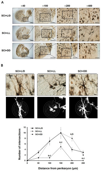 Golgi-cox stained sections of spinal cord from the rats subjected to controlled light/dark cycle. (A) Experimental animals were kept in controlled light/dark cycle; L/D, LL, and DD. A total of 3 days after SCI surgery, histological differences in the injured spinal segment were investigated. Magnification = ×4, ×100, ×200, ×400; Scale bar = 500 μm (×40, ×100), 200 μm (×200, ×400). (B) Neurite outgrowth of the neurons in Golgi-stained spinal sections was quantified using Sholl analysis method. The Sholl rings are separated by 10 μm. The data were expressed as mean ± SD. L/D, 12/12-h light/dark; LL, 24-h constant light; DD, 24-h constant dark. a p < 0.05 vs. L/D; b p < 0.05 vs. LL; Magnification = ×1000; Scale bar = 100 μm.