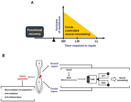 We investigated the effects of environmental lighting conditions regulating endogenous melatonin production on neural repair, following experimental spinal cord injury (SCI). Rats were divided into three groups randomly: the SCI + L/D (12/12-h light/dark), SCI + LL (24-h constant light), and SCI + DD (24-h constant dark) groups. Controlled light/dark cycle was pre-applied 2 weeks before induction of spinal cord injury. There was a significant increase in motor recovery as well as body weight from postoperative day (POD) 7 under constant darkness. However, spontaneous elevation of endogenous melatonin in cerebrospinal fluid was seen at POD 3 in all of the SCI rats, which was enhanced in SCI + DD group. Augmented melatonin concentration under constant dark condition resulted in facilitation of neuronal differentiation as well as inhibition of primary cell death. In the rostrocaudal region, elevated endogenous melatonin concentration promoted neural remodeling in acute phase including oligodendrogenesis, excitatory synaptic formation, and axonal outgrowth. The changes were mediated via NAS-TrkB-AKT/ERK signal transduction co-regulated by the circadian clock mechanism, leading to rapid motor recovery. In contrast, exposure to constant light exacerbated the inflammatory responses and neuroglial loss. These results suggest that light/dark control in the acute phase might be a considerable environmental factor for a favorable prognosis after SCI.