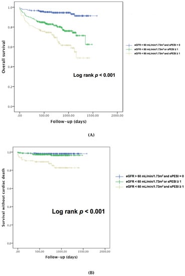 (A) Kaplan–Meier analysis for the probability of overall survival according to sPESI and renal dysfunction in patients with acute pulmonary embolism. (B) Kaplan–Meier analysis for the probability of cardiac survival according to sPESI and renal dysfunction in patients with acute pulmonary embolism.