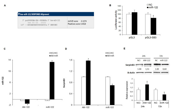 (A) miR-122 binding site in the SerpinB3 3’untranslated region (3′UTR) as reported by the TargetScan algorithm. (B) Dual-luciferase assay in HepG2 cells. The SerpinB3 3’UTR-containing vector was co-transfected with miR-122 or negative control (NC). MiR-122 overexpression determined a decrease of the reporter gene activity in pGL3-SerpinB3 co-transfected HepG2 cells. (C) qPCR analysis of miR-122 levels following miR-122 inhibitor (AM-122) or miR-122 mimic transfection in HepG2 cells stably overexpressing SerpinB3 (HepG2/SerpinB3) with respect to controls. U6RNA was used as housekeeping gene. Y-axis reports 2−ΔΔCt levels expressed in logarithmic form. (D,E) qPCR and Western blot analysis of SerpinB3 in transfected HepG2/SerpinB3 cells. β-Actin was used as housekeeping gene. Y-axis reports 2−ΔΔCt levels. NCi: miRNA inhibitor negative control; NC: miRNA precursor negative control. (* p ˂ 0.05). Data shown are representative results of at least three independent experiments.