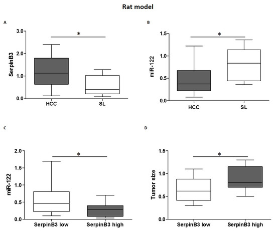 (A) SerpinB3 and (B) miR-122 expression in hepatocellular carcinoma (HCC) nodules and matched surrounding liver (SL) tissues from diethyl nitrosamine (DEN)-induced HCC rats. Y-axis reports 2−ΔΔCt levels from qPCR analysis. The values are represents as box-and-whiskers graph with the minimum, maximum, and median data. (* p ˂ 0.05 Mann–Whitney test). (C) MicroRNA (MiR)-122 expression in tumor tissues from HCC rats in relation to SerpinB3 expression. HCCs were grouped on the basis of SerpinB3 expression as detected by qPCR analysis (* p ˂ 0.05 Mann–Whitney test). Specifically, the high SerpinB3 group included HCC specimens with a cycle threshold (Ct) value lower than 35, whereas the low SerpinB3 group included HCC specimens with a Ct value higher than 35. (D) Box plot graph representing tumor size in HCC rats in relation to SerpinB3 expression (* p ˂ 0.05 Mann–Whitney test). Tumor size was represented by the value of major diameter (cm).