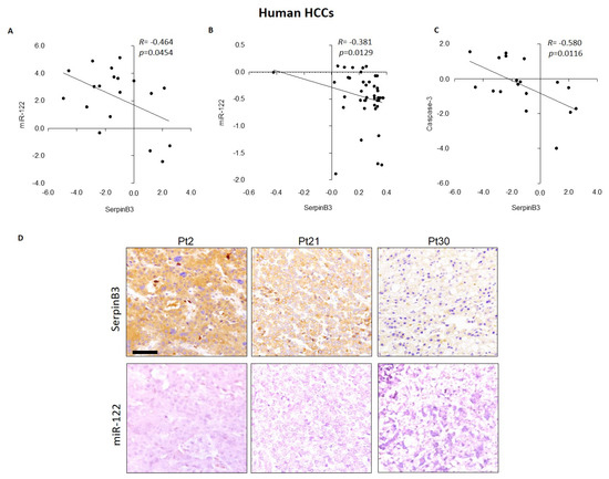 (A) Correlation graphs in human HCC tissues between miR-122 and SerpinB3 mRNA and (B) protein levels, as detected by qPCR and tissue microarray, respectively. Regarding the qPCR analysis, we considered only HCC samples with a Ct value lower than 35, which resulted in 19 out of 35 tested HCC samples. β-Actin was used as housekeeping gene for SerpinB3 normalization; U6RNA was used as housekeeping gene for miR-122 analysis. (C) Correlation graphs in human HCC tissues between SerpinB3 and caspase-3 mRNA levels, as detected by qPCR analysis. (D) Representative images of tissue microarray (TMA) in HCC samples from three patients (Pt2, Pt21 and Pt30) with different expression of miR-122 and SerpinB3 in sequential tissue slides. Scale bar 100 µM.