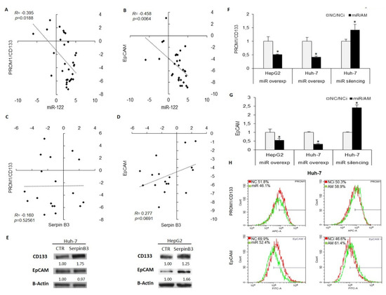 Moreover, to investigate further the involvement of miR-122/SerpinB3 axis on hepatocarcinogenesis, we assessed the relationship between miR-122 or SerpinB3 and stemness features in HCC. The expression of stem cell markers PROM1/CD133 and EpCAM/CD326 was analyzed by qPCR in the first patient cohort and in transfected HCC cell lines. MiR-122 inversely correlated with both PROM1/CD133 and EpCAM (Figure 4A,B), while a trend towards a positive correlation was observed between SerpinB3 and EpCAM mRNAs, but not with PROM1/CD133 (Figure 4C,D). In addition, we performed a WB analysis of stem cell markers in SerpinB3-overexpressing Huh-7 and HepG2 cells, chosen because of their well-characterized stemness features [27]. Increased PROM1/CD133 and EpCAM proteins were displayed in SerpinB3-overexpressing HepG2 cells with respect to empty vector cells, whereas SerpinB3-overexpressing Huh-7 cells showed PROM1/CD133 enhanced levels only (Figure 4E), suggesting that SerpinB3 might be, among other miR-122 target genes, in part responsible for miR-122 influence on stem cell characteristics in specific cellular contexts. In this line, decreased PROM1/CD133 and EpCAM levels were displayed in miR-122-overexpressing HepG2 and Huh-7 cells, whereas increased mRNAs levels were detected in miR-122-silenced Huh-7 cells (Figure 4F,G). The immunophenotype of PROM1/CD133 and EpCAM expression in miR-122-overexpressing and silenced Huh-7 cells mirrored mRNA levels (Figure 4H), demonstrating a negative regulation of stem cell features by miR-122 in HCC cells. Taken together, these data demonstrate that miR-122 regulates SerpinB3 and that SerpinB3 contributes, at least in part, to the modulation of stem cell phenotype exerted by the tumor suppressor miR-122 in HCC.