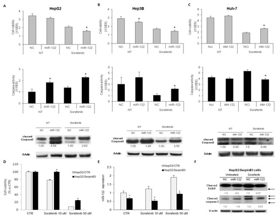 (A–C) In each panel, from the top to the bottom: cell viability and caspase 3/7 activity assays and western blot analysis of cleaved caspase-3 in HepG2 and Hep3B cells overexpressing miR-122 (A,B) and in Huh-7 cells transfected with miR-122 inhibitor (AM-122) (C) following vehicle (NT) or sorafenib administration. β-Actin was used as housekeeping gene in western blot analysis and numbers represent fold-change values. NC: miRNA precursor negative control; NCi: miRNA inhibitor’s negative control. (D) Cell viability assay in SerpinB3-overexpressing HepG2 cells following sorafenib treatment (10 and 50 µM for 48 h). (* p ˂ 0.05 Mann–Whitney test). (E) MiR-122 quantification in SerpinB3-overexpressing HepG2 cells following sorafenib treatment. (* p ˂ 0.05 Mann–Whitney test). (F) Western blot analysis of cleaved Poly(ADP-ribose) polymerase 1 (PARP) and cleaved caspase-3 in HepG2 cells overexpressing SerpinB3 (HepG2/SerpinB3) transfected with miR-122 in untreated or sorafenib (10 µM)-treated cells (48 h). β-Actin was used as housekeeping gene in western blot analysis and numbers represent fold-change values. NC: miRNA precursor negative control.