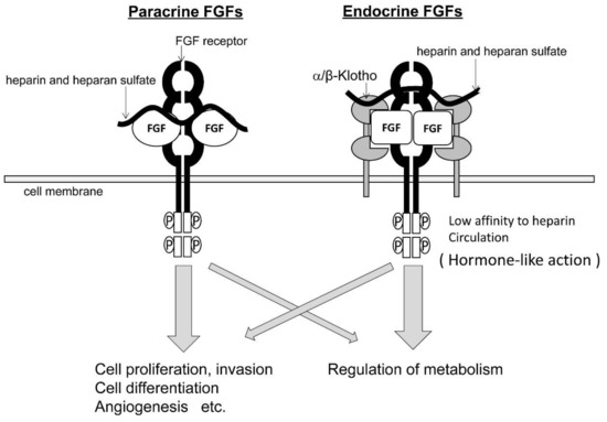 Endocrine FGFs consist of FGF19, FGF21, and FGF23. These molecules have a low affinity to heparin/heparan sulfate in contrast to paracrine FGFs. They have to form complexes with co-receptors, α/β-Klotho, to bind to the extracellular domain of FGFR. Because the endocrine FGFs’ affinity to FGFRs changes depending on the existence of α/β-Klotho, they have hormone-like activity beyond functioning as a growth factor (Figure 2). Several studies have demonstrated the physiological function of endocrine FGFs (Table 1) [4]. Among endocrine FGFs, FGF15 (the mouse orthologue of human FGF19) was the first molecule to be identified. The physiological activity of FGF19, including the regulation of glucose and bile acid metabolism, is exerted through the formation of a complex with FGFR4 and beta-klotho and follows the activation of a signaling cascade by recruiting adaptor proteins in cytoplasm [5,6,7]. FGF21 mainly acts as a metabolic regulator in the liver, adipose tissue, and the pancreas. The tissue-specific metabolic action of FGF21 depends on its specificity to the receptor. FGF21 binds with beta-klotho and FGFR1c [6,8,9]. FGF23 is a bone-derived endocrine hormone. Expression of FGF23 is induced by activation of the vitamin D receptor (VDR) with 1,25 dihydroxyvitamin D (1,25D), and FGF23 is a suppressor of 1,25D. So FGF23 and 1,25D are linked by mutual regulation. A signaling cascade of FGF23 activates through formation of a complex with alfa-klotho and FGFR1 for the kidney and FGFR3c for the parathyroid gland. FGF23 regulates phosphate and vitamin D metabolism in the kidney and inhibits parathyroid hormone secretion and vitamin D synthesis in the parathyroid gland [10,11].