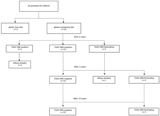 - Auricchio, R.; Tosco, A.; Piccolo, E.; Galatola, M.; Izzo, V.; Maglio, M.; Paparo, F.; Troncone, R.; Greco, L. Potential celiac children: 9-year follow-up on a gluten-containing diet. Am. J. Gastroenterol. 2014, 109, 913–921. [Google Scholar] [CrossRef] [PubMed]