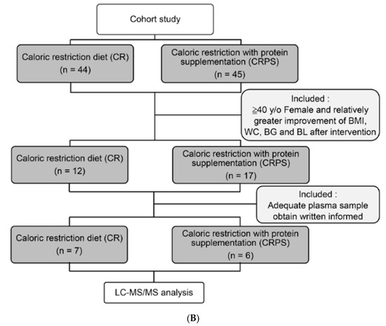Clinical studies have shown that caloric restriction (CR) causes weight loss, changes body composition, and decreases a person’s basal metabolic rate [5,6,7]. These effects are believed to result from lowering the thermic effect of feeding and reducing thermal substrates. Thus, it has been considered that CR can cause metabolic adaptation. A study reported that short-term CR influenced the secretion of adipokines from adipocytes (e.g., increased adiponectin levels and decreased leptin levels in blood), but there was no significant difference in the amount of fat-free mass [8]. Such a change has been regarded as in accordance with alleviation of diseases associated with MetS (e.g., atherosclerosis and type 2 DM) [8]. Additionally, CR has been shown to reduce visceral fat [7] and has been highly correlated with improvements in insulin levels in people with obesity. However, the effects of CR for alleviating metabolic abnormalities are usually not as notable as expected. A study reported that caloric restriction with protein supplementation (CRPS) promoted weight loss, improved the biochemical markers associated with metabolism, increased lean body mass preservation, accelerated adipose tissue catabolism, and helped maintain weight loss by increasing satiety, thermogenesis, and myofibrillar protein synthesis [9,10]. However, proteomic animal and human studies have reported that plasma or tissue protein profiles might be influenced by CR [11,12] and may be partly responsible for changes in metabolism.
