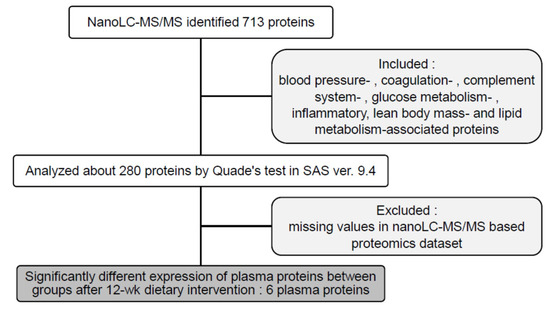 Differences between the postintervention clinical and biochemical characteristics of the treatment groups were compared using the Mann–Whitney U test. A comparison between the baseline and postintervention clinical and biochemical measurements between the groups was conducted using the Wilcoxon signed-rank test. Using the LC-MS/MS-derived proteomics data, the nonparametric Quade’s test was adopted to compare the different postintervention protein expressions between the treatment groups with baseline measurements as covariates. Moreover, a Spearman’s rank correlation coefficient was calculated to evaluate the relationship between the specific plasma protein expressions and clinical variables. All statistical analyses were performed using SAS version 9.4. Data are presented as the median (75th percentile values in parentheses), and p < 0.05 was considered statistically significant.