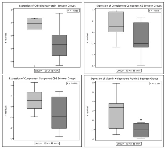 A proteomic analysis conducted using LC-MS/MS (Thermo Scientific LTQ-Orbitrap Elite, Thermo Fisher, Bedford, MA, USA) revealed that postintervention alpha-2-macroglobulin (A2M) protein expression in the CRPS group was significantly higher than in the CR group. Furthermore, C4BPA, complement C1r subcomponent–like protein (C1RL), C6, C8G, and PROS expression was significantly lower in the CRPS group than in the CR group after intervention (Table 2). To verify the results derived from LC-MS/MS, ELISA kits were used to determine the absolute amount of proteins. C4BPA, C6, C8G, and PROS expression between the groups was consistent with the results obtained from LC-MS/MS (Figure 3).