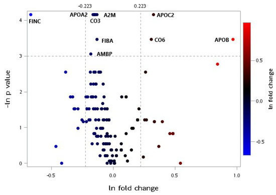 Figure 5 displays a volcano plot of the plasma selected proteomic ratio measurements within each group throughout the trial. The proteins depicted as red dots represent the plasma protein levels that increased significantly (p < 0.05) with a 1.25-fold change (25% change threshold), whereas the proteins depicted as blue dots represent the plasma protein levels that decreased significantly to 25% changes of the original value. Apolipoprotein A2 (APOA2), complement component 3 (C3), A2M, fibrinogen alpha chain, alpha-1-microglobulin/bikunin precursor (AMBP), and fibronectin (FINC) levels decreased significantly following the 12-week intervention in the CR group. Moreover, apolipoprotein B-100 (APOB-100), apolipoprotein C2 (APOC2), and C6 levels increased significantly throughout the intervention in the CR group (Figure 5). Moreover, FINC levels decreased significantly following the 12-week intervention in the CRPS group (Figure 6). The detailed proteins characteristics were shown in Supplementary Materials.