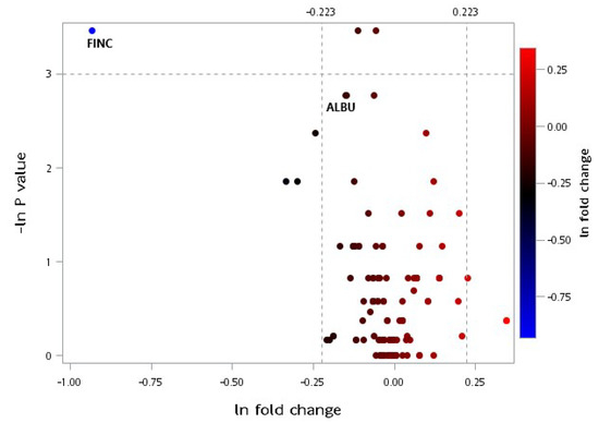 Volcano plot of plasma selected proteomic ratio measurements between baseline and postintervention in the CRPS group. Fold change represents the postintervention value divided by the baseline value, and the p-value is associated with a Wilcoxon signed-rank test that compared the different protein expression levels before and after the interventions within the group. Thresholds are presented as dotted lines. The fold change cut-off points were 1.25 and 1/1.25, and the p-value cut-off point was 0.05. Both sets of data were converted to a natural logarithm as shown. CRPS: caloric restriction with protein supplementation, ALBU: albumin, FINC: fibronectin.