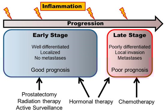 Chronic inflammation is the major etiology behind the development of several cancers, such as hepatocellular carcinoma, squamous cell carcinoma in the urinary bladder, colorectal cancer, and gastric cancer. Inflammatory cells migrating to the local area generate reactive oxygen species and reactive nitrogen species that induce mutations of DNA in normal epithelia []. Acute or chronic inflammation is a common histological finding in both benign and malignant tissues in prostatectomy specimens [,]. The causes of inflammation in the prostate vary among bacteria causing prostatitis and sexually-transmitted disease, hormonal changes of estrogen [], physical trauma caused by corpora amylacea [,], urine reflux to the prostate gland, and environmental factors such as dietary habits [,]. Dietary habits cause inflammation of the prostate and can result in carcinogenesis in the early stage [,]. Dietary-induced inflammation could last for the entire life, and chronic inflammation can also stimulate the progression of prostate cancer in the late stage. However, the association of immune cells in tumor microenvironments with prostate cancer is still unclear.