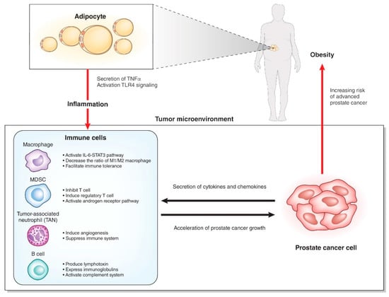 It is still unclear how such systemic inflammation affects local inflammation of the prostate (Figure 2). Several chemokines and cytokines secreted from prostate cancer cells may recruit immune cells to the prostate. Which organ are these immune cells activated in? Some immune cells could be “taught” in the intestinal wall [], but there has been no evidence of the homing of these intestinal immune cells to a distant organ. In bone marrow or regional lymph nodes, the immune cells might be activated by factors related to obesity and subsequently recruited to the prostate. Otherwise, the local immune cells recruited by prostate cancer cells might be activated by the obesity-related factors. The elucidation of these factors related to obesity could lead to the development of new treatments or the prevention of prostate cancer in the early stage.